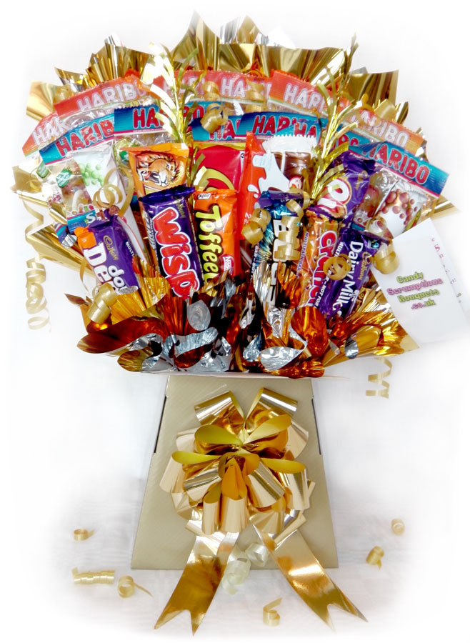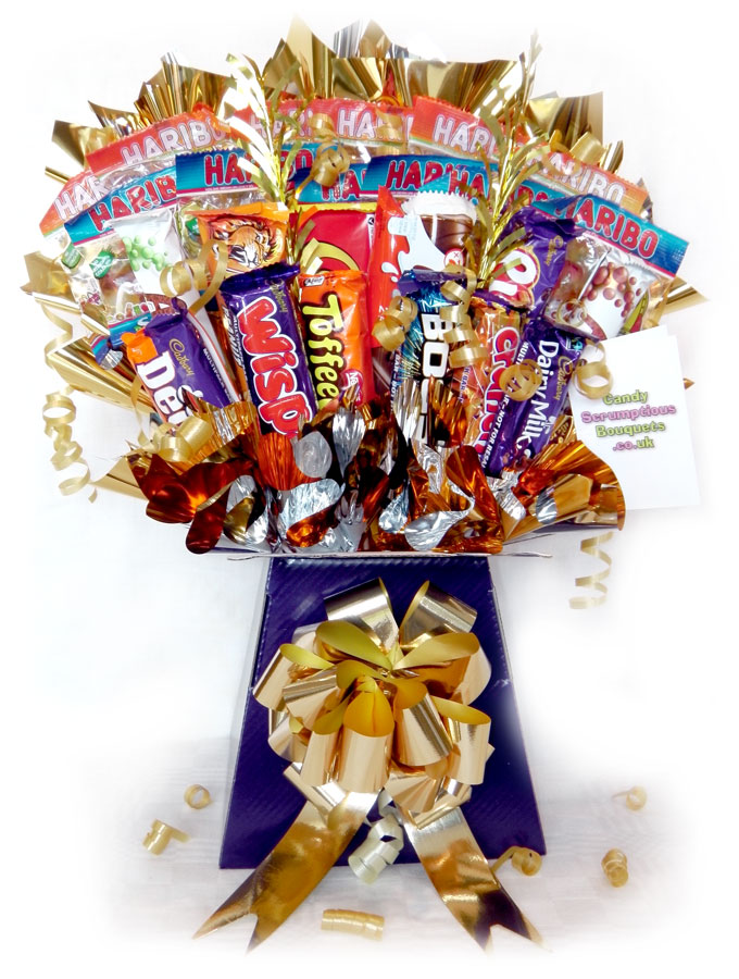 By popular demand, one of our best selling bouquets, in a box style. Now you don't have to decide between a Candy or Chocolate bouquet, we've combined the two into one big mixed selection!
